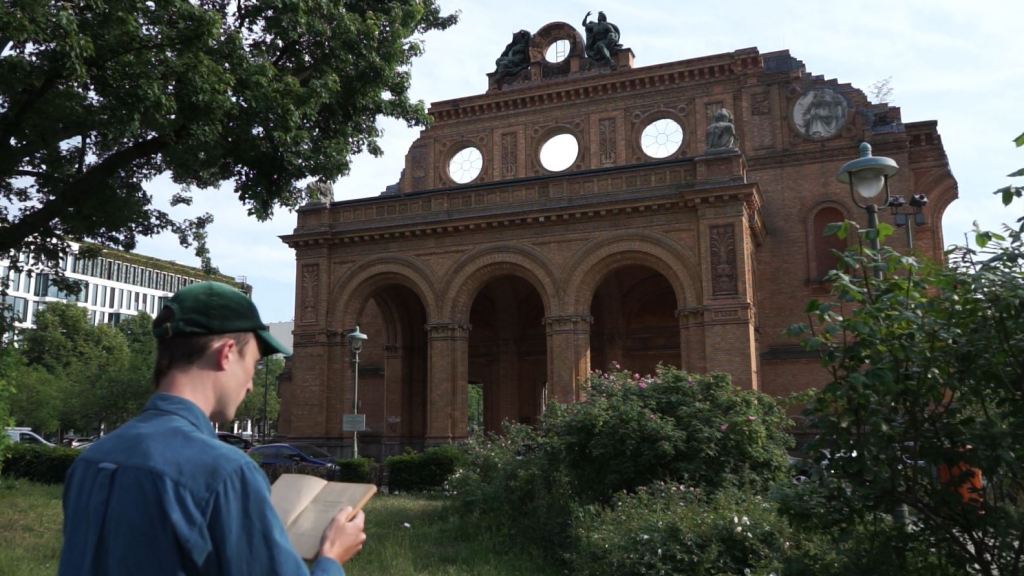 The performance and video "Umsiedlung der Märzenbecher" is a work by Juri Joosten and Carl Hartmann realised in June 2022. It relates the ruin of Berlins former train station Anhalter Bahnhof with the transformed landscape of Bitterfeld where the yellow bricks orginate from. The forest "Goitzsche" in Bitterfeld was transformed into a huge open mine to extract clay for the famous bricks called Greppiner Klinker and coal. In the performance an extract of a book that reflects these changes in Bitterfeld is read out to to ruin.