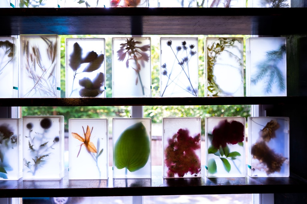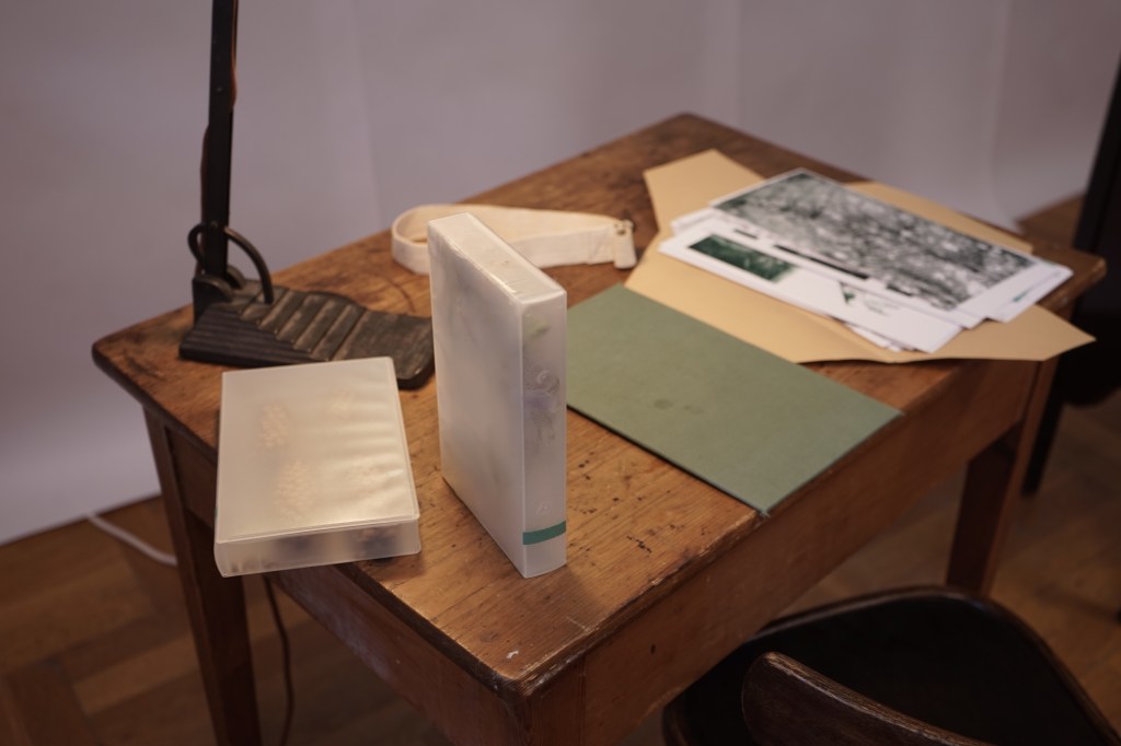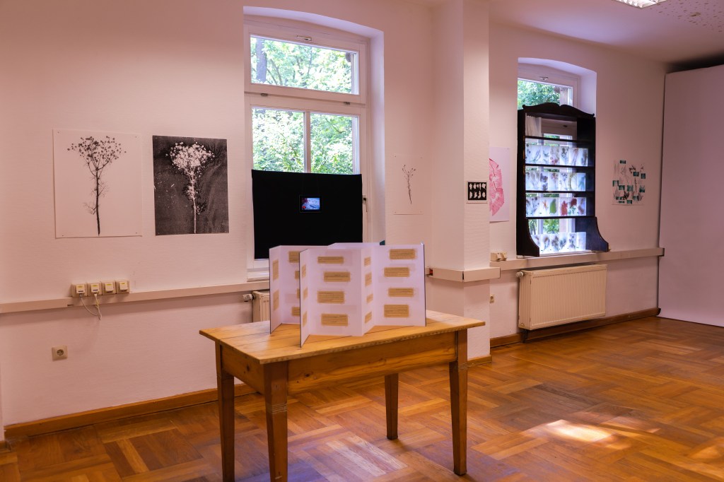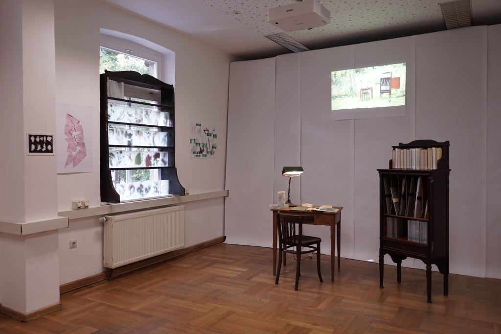 There is a workstation with a herbarium cabinet in the centre of the room. Within the cabinet and on the walls, there are Pflanzenabbilder (plant reproductions), some of them inaccessible in sealed fascicles and all of them unnamed. In the cabinet and on the window shelf there are transformed books that document plant collection walks (Blättern) and so-called Schaukastenbücher (showcase books), transparent books that contain fresh plants that are wilking. A video is projected behind the herbarium cabinet that shows the installation in a "natural context" outside and an encounter with a bird. Another video is installed in a window showing the gestures of mounting plants on herbarium paper in Herbarium Haussknecht while at the same time one can see trees and plants outside growing and rustling. Two of the three Pflanzen-Belege (plant specimens), leporellos with text leaves, are placed on a table. They represent a collection of theoretical perspectives in the form of text artifacts.