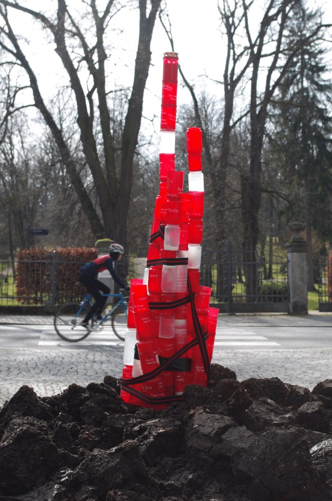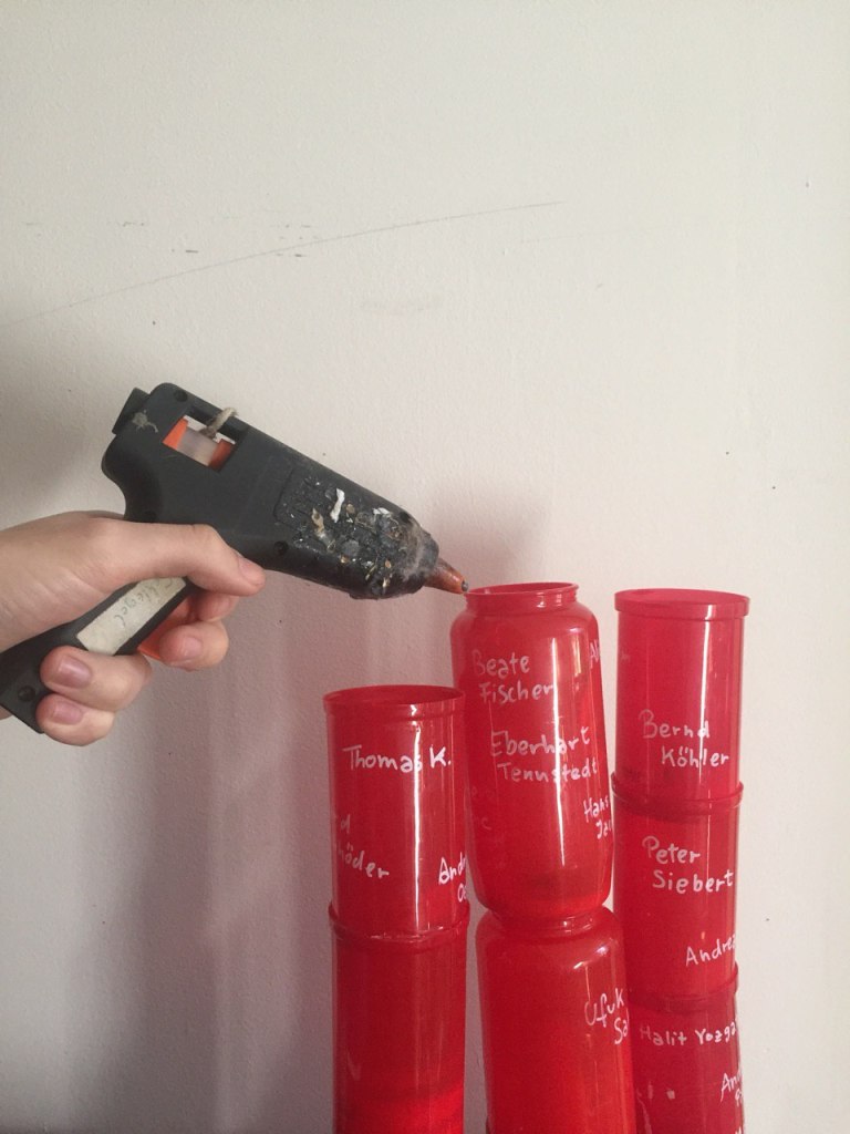 It consists of mourning lights that are typically used for such spaces with the names of 208 victims of far-right terror in Germany since 1990. The mourning lights are glued and tied together to form a monument that resembles Tatlin's Tower. Only the mourning light on top has a candle and a golden cover.